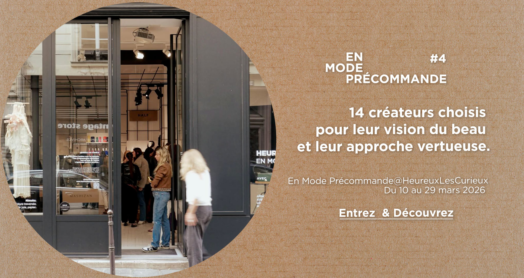 HEUREUX LES CURIEUX est un concept innovant de commerce qui offre aux marques et aux consommateurs un tête à tête inédit. L’expérience est la clé, elle réveille les sens et redonne du sens à la consommation. De la confiance et de la conscience. Plus qu’un énième pop-up, HEUREUX LES CURIEUX est un lieu durable. On y est, on y reste : 23, rue du Pont-aux-Choux à Paris. Notre adresse, la première. Celle d’un Ephémère pérenne.